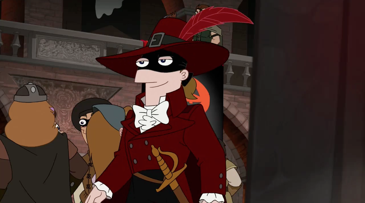 Back at the party, vanessa finally sees monty in his scarlet pimpernel outfit as ferb discards his turtleneck for a dapper suit.